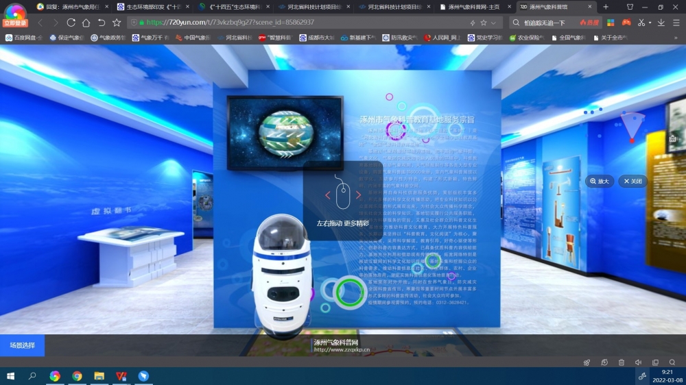 二、建立云端科普馆。做科普就要上得了“云端”接得了“地气”,同时在疫情防控大背景下,“线下”科普活动受限,要求气象科普以“加速冲刺”的方式跑步与“线上”融合。将实体气象科普馆参观内容“变成”云端气象科普馆,以三维立体的方式完整呈现于网络上。公众可通过网页、微信公众号等渠道,随时在线参观涿州市气象科普馆,360度沉浸式虚拟体验馆内展示内容,配合语音讲解,足不出户尽情“云游”气象科普教育基地,拉近大众与科学知识之间的距离,尽显智慧科普“魅力”。